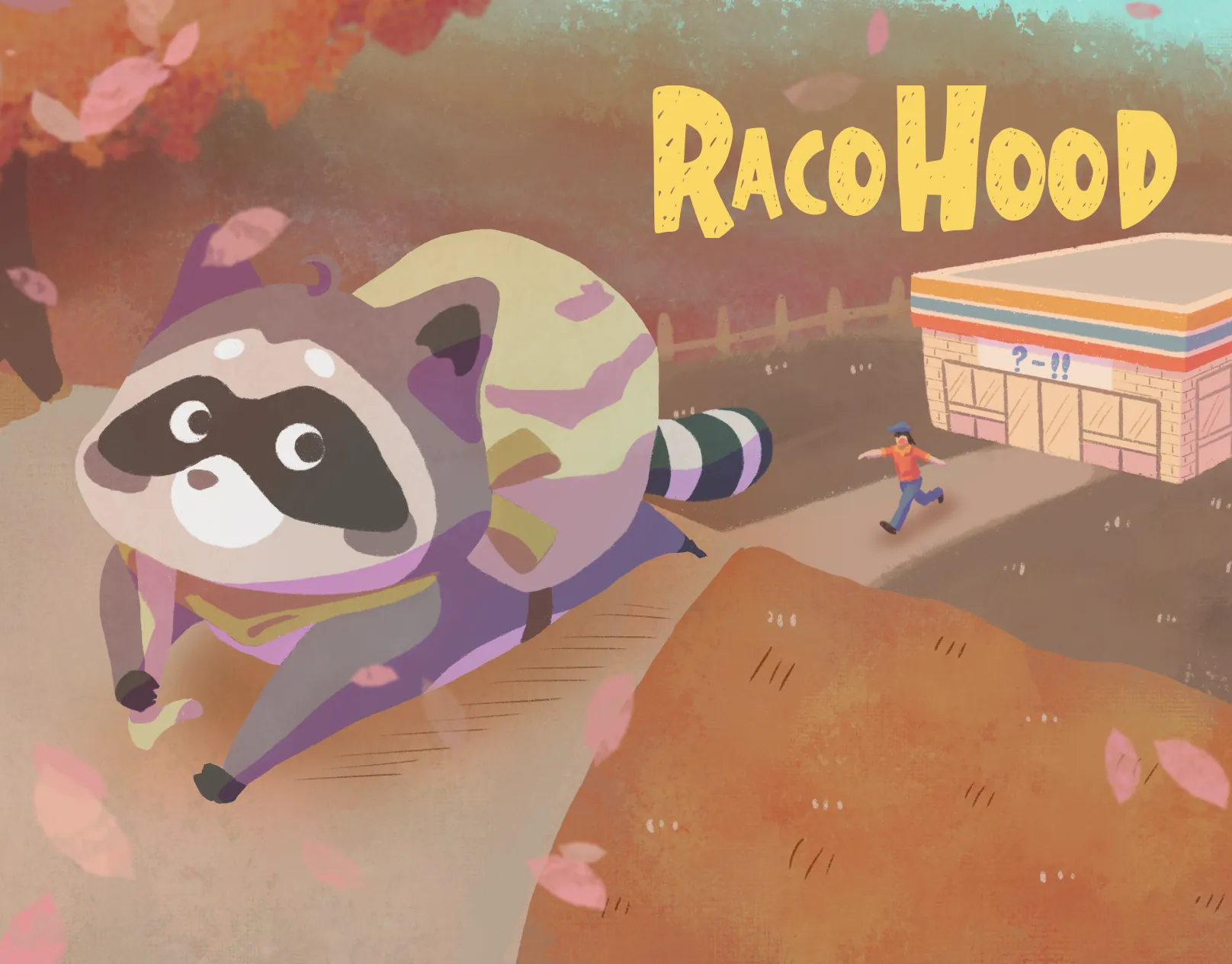 A raccoon searches for food in a convenience store and defends itself against threats by playing rock-paper-scissors to defeat the evil customer.
