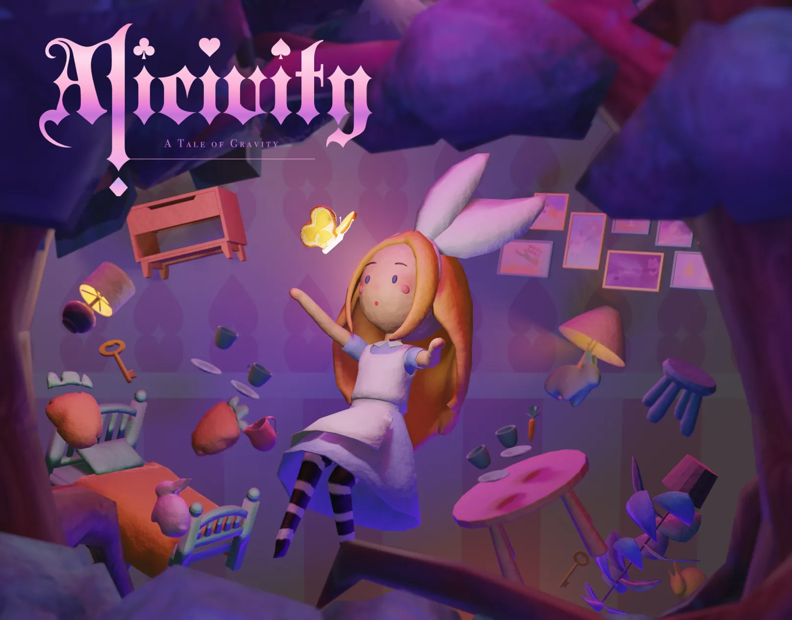 A VR puzzle game set in the world of Alice in Wonderland, where a dreamy, surreal atmosphere is created through a palette of blue and violet tones.